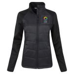 The contrasting design of the Port Authority® Ladies Hybrid Soft Shell Jacket makes it stand out in a crowd. This water-resistant layer offers comfort with an edgy look. Customize with your logo and promote your brand.