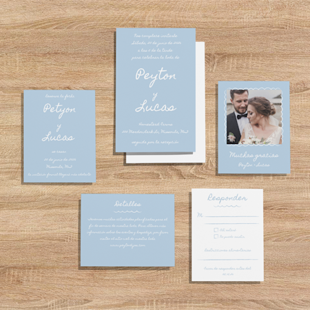 Nuestra colección tiene todos los elementos que requiere su conjunto de papelería para invitar: invitaciones, tarjetas de RSVP, tarjetas anexas y tarjetas de agradecimiento.