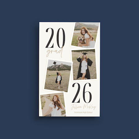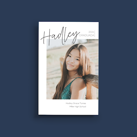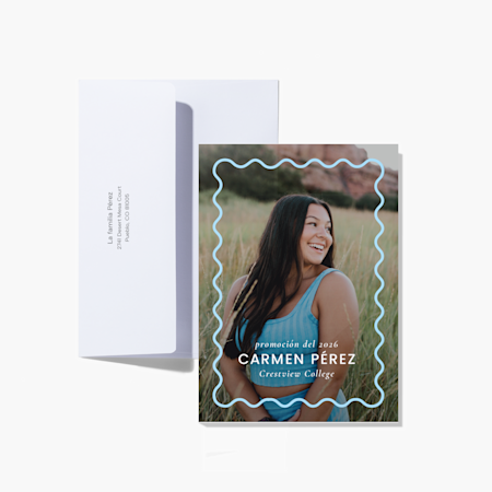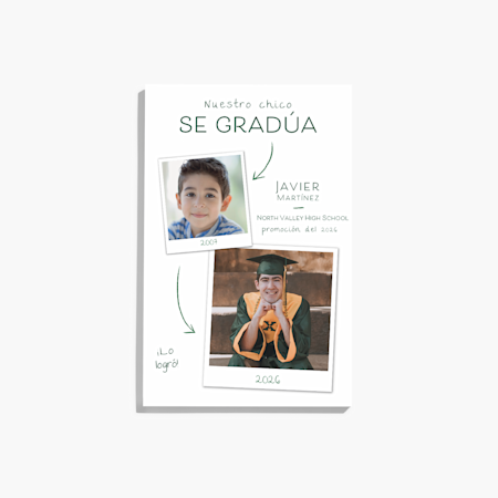 Nuestra colección de plantillas de 2026 abarca una variedad de estilos de moda, como cuadrícula de fotos, minimalista, sofisticado, clásico y muchos más, para que pueda encontrar el que mejor se adapte a la personalidad de su graduado. Porque todos los estudiantes merecen un trato especial, ofrecemos tarjetas de graduación personalizadas para estudiantes de medicina, grados avanzados e incluso para graduados de PreK-8. Cuando haya encontrado la combinación perfecta, cargue su retrato o foto de graduación y agregue un mensaje especial. Cuando haya terminado su pedido, imprimiremos sus tarjetas y artículos con calidad profesional. Confíe en nosotros, llevamos mucho tiempo haciéndolo (más de 20 años, pero ¿quién lleva la cuenta?). Y si necesita ayuda diseñando o haciendo su pedido, nuestros expertos están listos, porque, después de todo, las grandes noticias como esta deberían ir acompañadas de diversión y no de estrés.