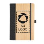 Mantén tus ideas organizadas y tu logotipo en cada escritorio con este diario A5 que cuenta con 80 páginas rayadas, cubierta de bambú, cierre elástico y presilla para bolígrafo.