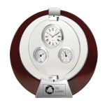 Este accesorio de escritorio combina un reloj, un termómetro y un higrómetro en una pantalla elegante. Fabricado en palo de rosa y metal plateado para un aspecto refinado.