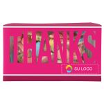 Muestre su agradecimiento a su equipo o clientes con esta llamativa caja troquelada llena de deliciosos dulces de corazón de tres capas. Sorprenda a sus empleados más valiosos en ocasiones especiales o agradezca a sus clientes su fidelidad con este dulce detalle. Es fácil de personalizar: agregue su logotipo, mensaje o información usando nuestro intuitivo estudio. ¿Necesita ayuda? Nuestros expertos en diseño están aquí para ayudarle a hacer realidad sus ideas.