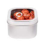 Lata de chocolates en forma de pelotas de básquetbol con ventanilla