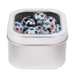Lata de chocolates en forma de pelotas de fútbol con ventanilla