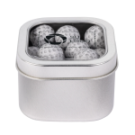 Lata de chocolates en forma de pelotas de golf con ventanilla