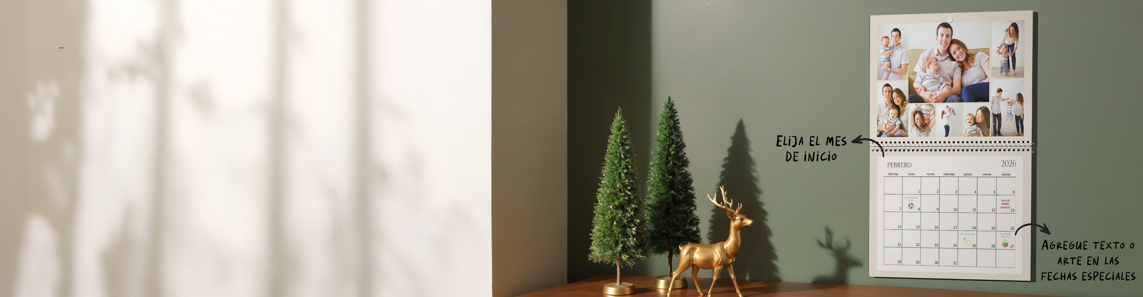 Recomendamos que elija el calendario que mejor se acomode a su oficina, escritorio u hogar. Nuestro calendario grande de pared (elija el tamaño de 22.5" x 14.5") es perfecto para que las familias lleven el control de varias actividades y eventos, mientras que un calendario de escritorio es indispensable para las personas que trabajan en remoto. Los calendarios imantados son perfectos para el refrigerador. Los calendarios de pared pequeños o medianos (11.5" x 8" y 17" x 11"), personalizados con 12 de sus imágenes favoritas, junto con íconos especiales para cumpleaños y más, son lindos regalos para todos.