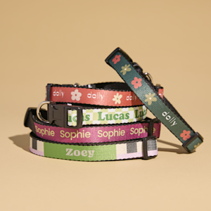 Ofrecemos collares para perro personalizados en 3 tamaños ajustables, para que pueda adaptarse al cuello de su perrito. La banda está hecha de nailon suave y ultra fuerte para que tolere todos los tirones y jugueteos de su perro y el collar tiene una argolla de metal para sujetar la correa o un identificador. Los collares personalizados se pueden lavar a máquina, por lo que son perfectos si a su perro le gusta revolcarse en el barro. (Ojalá fuera igual de sencillo bañar a su perro.)