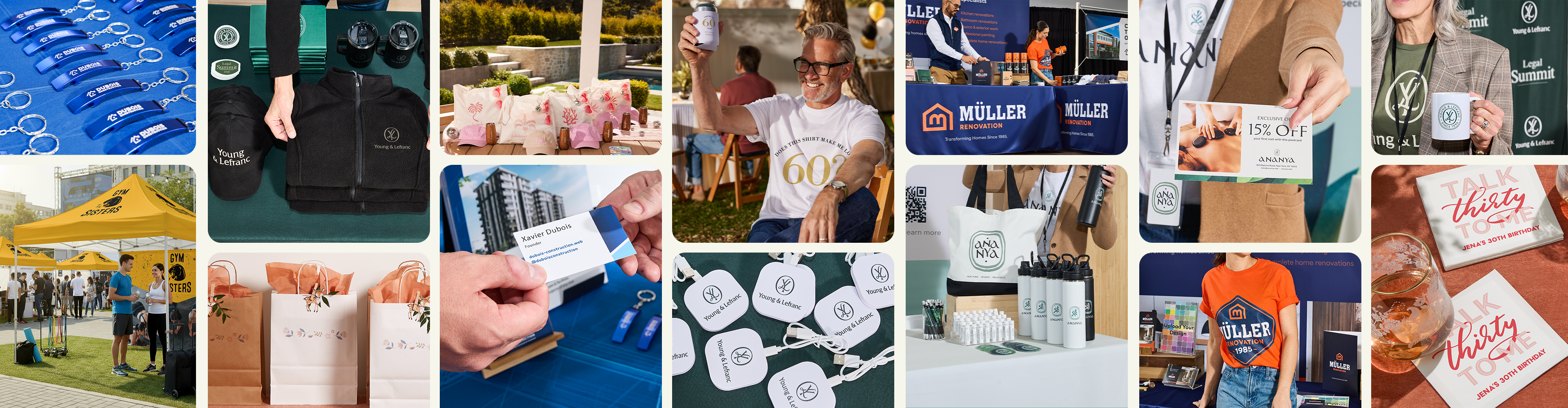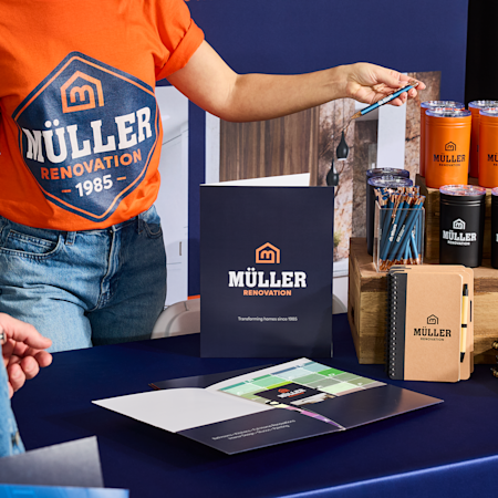 Start with the basics: Display tables, backdrops and retractable banners that let your business shine from every angle. Consider the size and scope of your average event – do you need to be spotted above a crowd, or stop attendees in their tracks as they pass by? Does your booth need a lot of space, or can you showcase your product on tabletops or shelves? Whatever your needs, our easy-to-use tools help you create the perfect event materials so you can spark connections and keep every conversation going. Then, go further with event merchandizing that reinforces your message at every touchpoint – from branded giveaways to coordinated event clothing that keep your brand top of mind.
