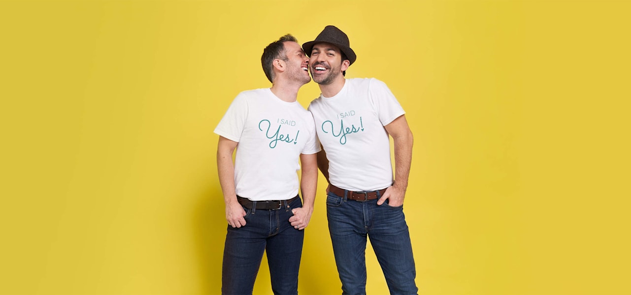 If you’re planning on getting engaged soon, create T-shirts that say, “He/She/They said yes!” (depending on your partner’s gender identity)—and then, order those t-shirts for yourself, your partner, and the people closest to you. Once you’ve proposed (and your partner has said yes) invite your friends and families over to celebrate. Ask them to wear their custom tops and snap a photo of the group. You can then use the photo as your engagement announcement—include it on your wedding website or the announcement cards you send to loved ones who couldn’t be there.