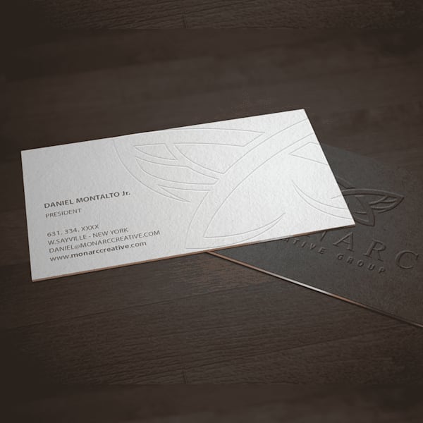 This is a great example of how business card design can subtly communicate what your business is about or what it does. Instead of handing over a card with your logo, this trend lets you create connections through a fragment of your brand story. To implement this trend, emboss textures that speak to your business, create a motif referencing your product, add a pattern echoing your niche or highlight a signature shape that defines your brand. These subtle and simple touches can make your cards feel both personal and distinctive.