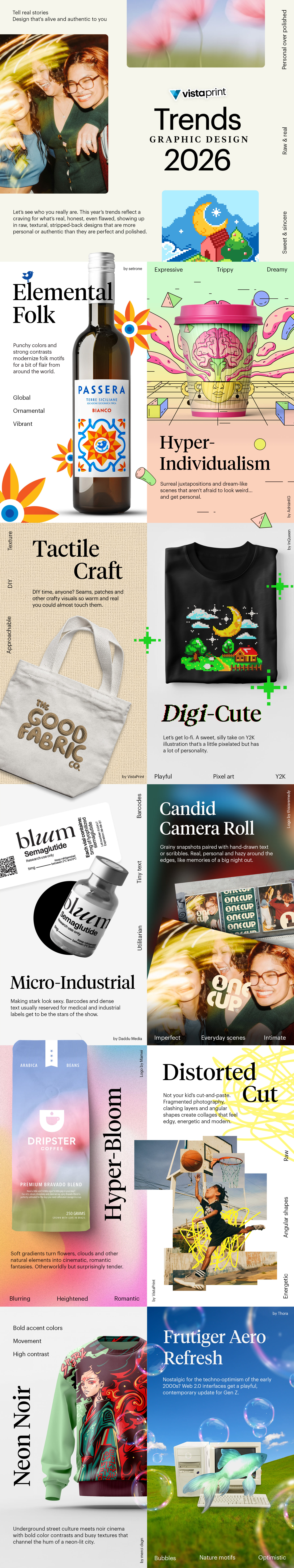 We spoke to the 99designs by Vista community of freelance designers, as well as design experts within VistaPrint, and our research tells us that what resonates now is design with personality, sincerity, emotion and a human touch. From hand-drawn elements, candid scenes and tactile textures that feel distinctly human in an AI-driven world to trippy, dreamy and amplified digital visuals, we’ll walk you through the design trends worth watching, why they matter and how you can borrow from them to appeal to customers today. Small businesses can tap into these graphic design trends 2026 to connect with audiences in a way that feels modern, creative and authentic.