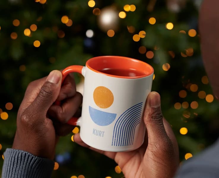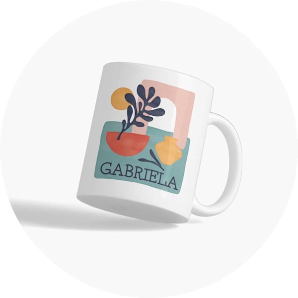 A minimalist graphic, whether bold and geometric or Matisse-style cut-out shapes, will bring artistic flair to your custom mug design. Add the recipient’s name to make this creative mug design feel more personalized. This style works especially well for retail or online stores, as simple designs photograph well and appeal to a broader customer base.