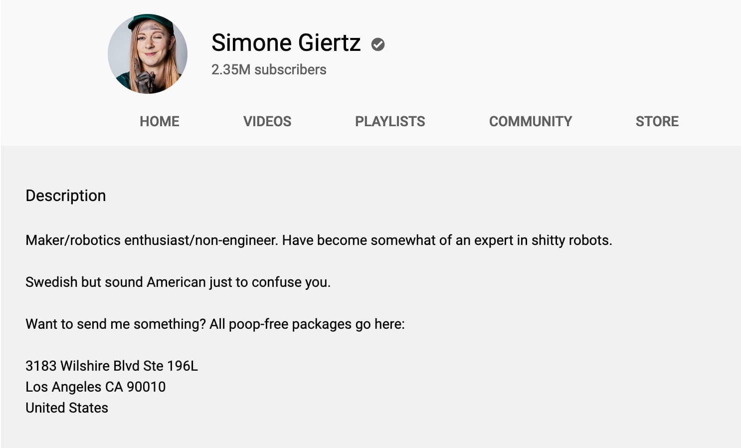 The brilliant and witty voice of Simone Giertz can be found in her channel description. It quickly gives you an idea of the content she makes, but she still manages to curse and mention poop. Hey, now you won’t be surprised!