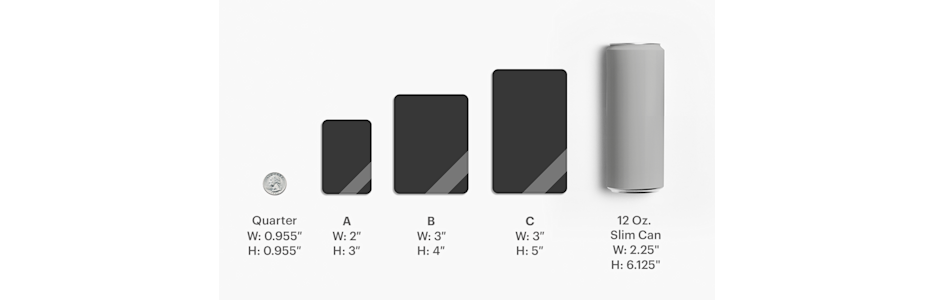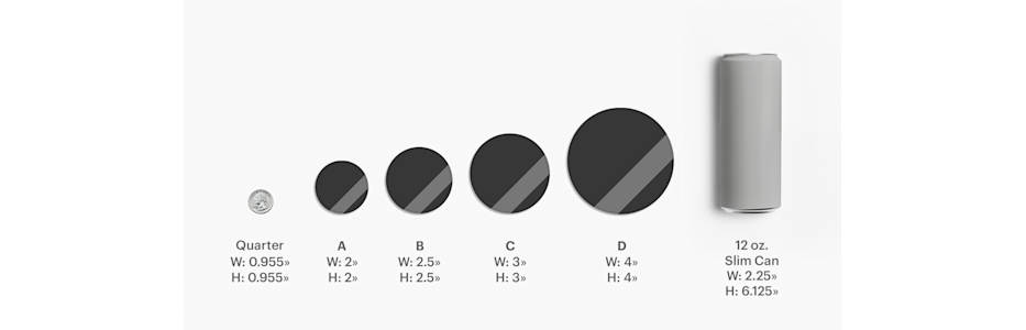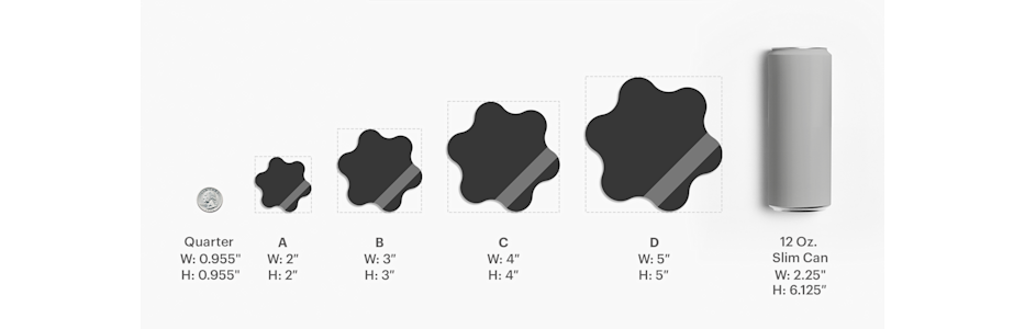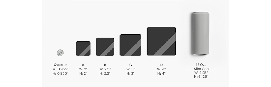 Our custom shapes are available in these size options: 2" x 2", 3" x 3", 4" x 4", 5" x 5".