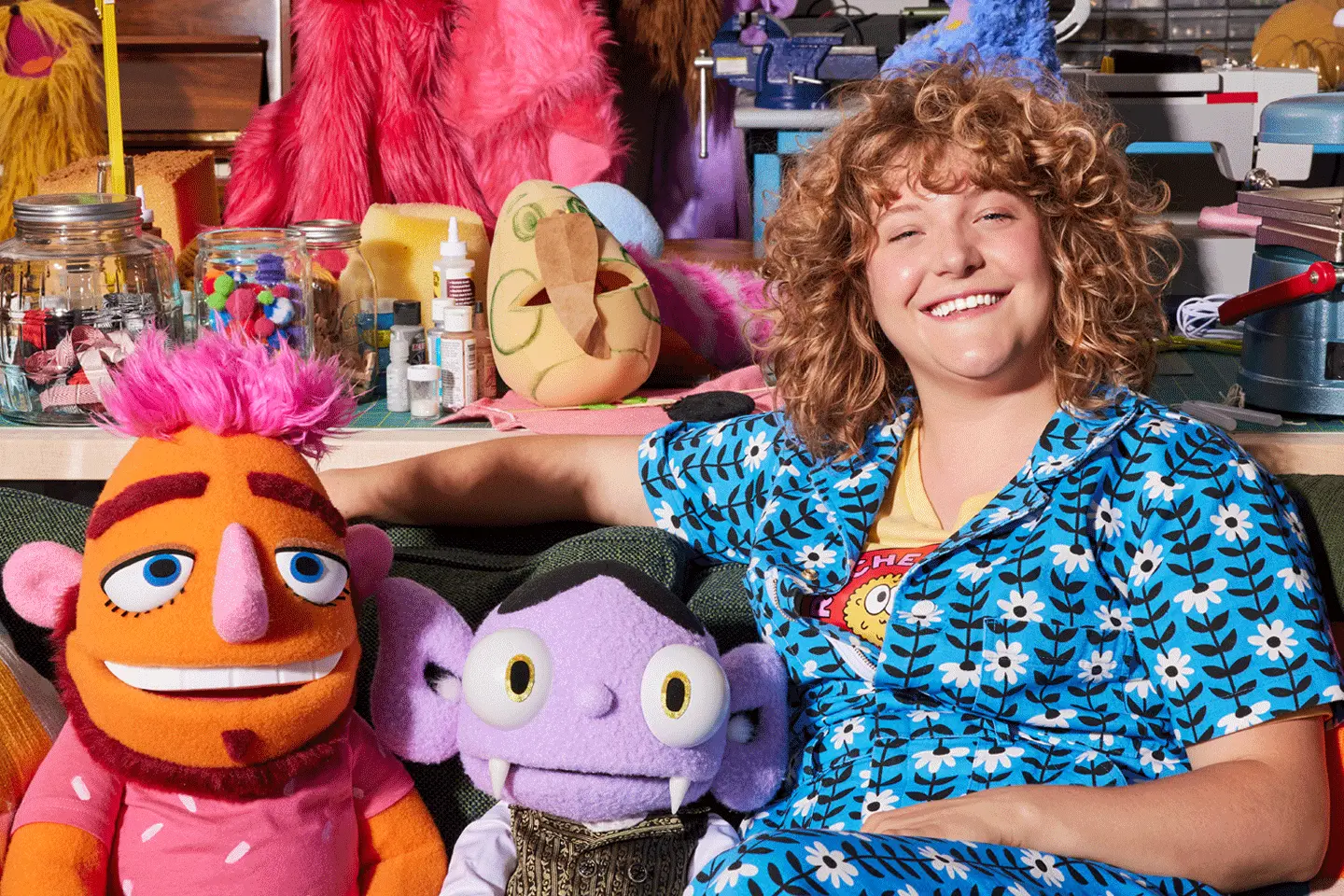 Rachel from Rachel Made Studio sitting beside two handmade puppets